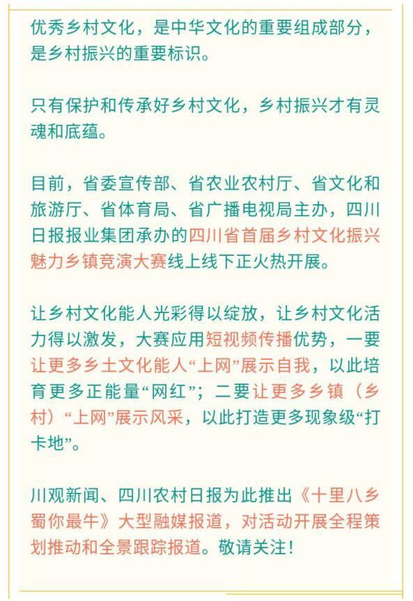 4月底,省委宣传部、省农业农村厅、省文旅厅、省体育局、省广播电视局主办,四川日报报业集团等承办的四川省首届乡村文化振兴魅力乡镇竞演大赛火热开启,活动线上线下搭建了展示乡土文化能人和魅力乡镇的舞台,挖掘、发现、推出更多的“丁真”“李子柒”,为乡村文化、文脉传承、文旅发展助力。