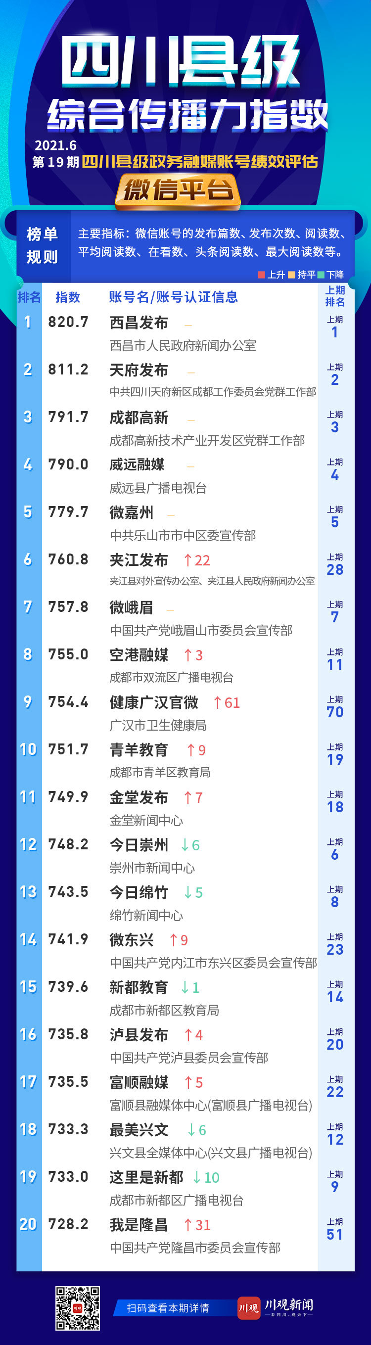 和上一期相比,前5位排位保持不变,“夹江发布”“健康广汉官微”“我是隆昌”分别上升了22位、61位、31位,进入前20榜单,也是上升幅度前三的微信账号。