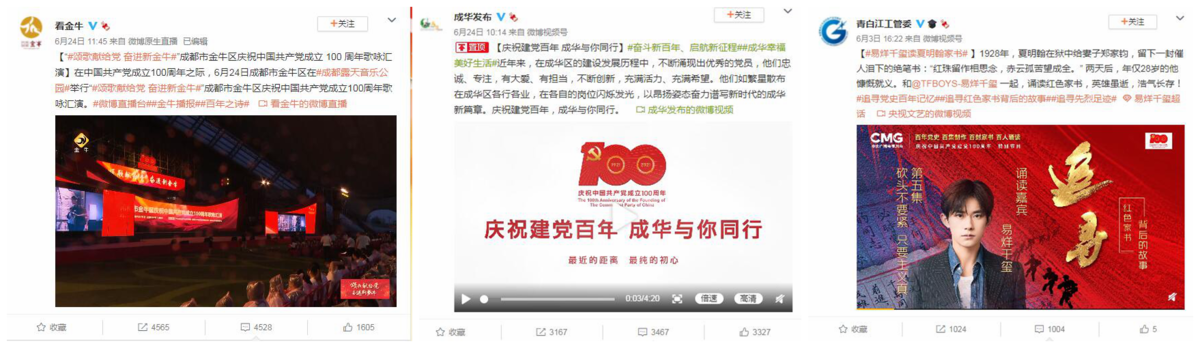 庆祝中国共产党成立100周年,各地举办多种活动掀起热潮。6月,各地庆祝建党百年的活动进入高潮,包括重温入党誓词、党史答题、文艺晚会、红色电影作品展演、主题展览等等,形式丰富多彩,积极营造“党的盛典、人民的节日”浓厚氛围。比如,青羊区举办比赛展现青年教师综合素质风采,微信号“青羊教育”发布《官宣!50名青年教师入选“青锐计划”》获得超10万阅读量,位列第一;微信号“恩阳发布”的《恩阳“唱支山歌给党听”红歌传唱比赛第二场来了~》也获得了4万多的阅读量。