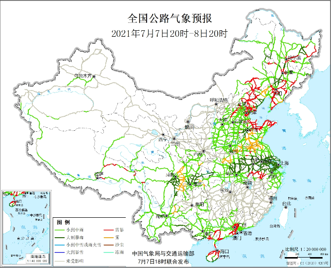 中国气象局与交通运输部2021年07月07日联合发布全国主要公路气象预报:7月7日20时至8日20时,江苏中南部、安徽中部、河南南部、湖北东北部和西南部、重庆北部、四川东部和西南部、海南岛南部、广西西南部、云南东南部以及山东北部、辽宁西部、吉林西部、黑龙江东部等地的部分地区有大到暴雨,局地大暴雨,上述地区局地伴有雷暴天气。另外,辽宁南部和西部、山东中南部、河南中南部、江苏北部、安徽北部、湖北北部、陕西南部、四川盆地西部和南部、重庆中部和东南部、贵州西南部、云南东北部等地局地有雾。