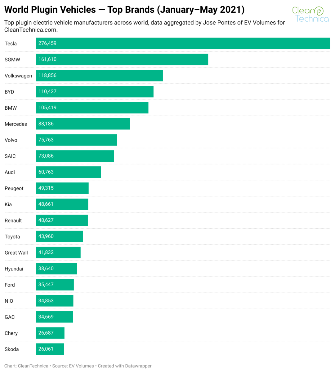 CleanTechnica公布了2021年1-5月全球新能源汽车销量数据