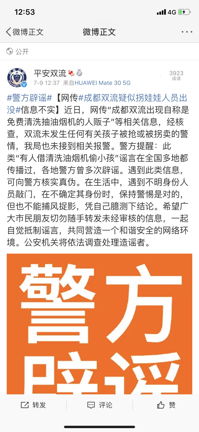 7月9日,成都市公安局双流分局发布辟谣消息。近日,网传“成都双流出现自称是免费清洗抽油烟机的人贩子”等相关信息,经核查,双流未发生任何有关孩子被抢或被拐卖的警情,该局也未接到相关报警。