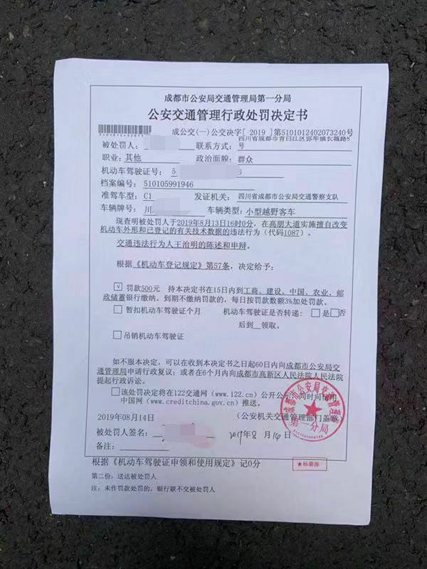 经查,该行为违反了《机动车登记规定》第57条之规定—擅自改变机动车外形和已登记的有关技术数据。成都交警一分局决定,对车辆所有人处以罚款500元,记0分的处罚。
