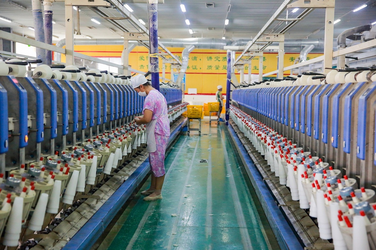 纺织生产车间里,女工正在生产流水线上工作。黄刚 摄