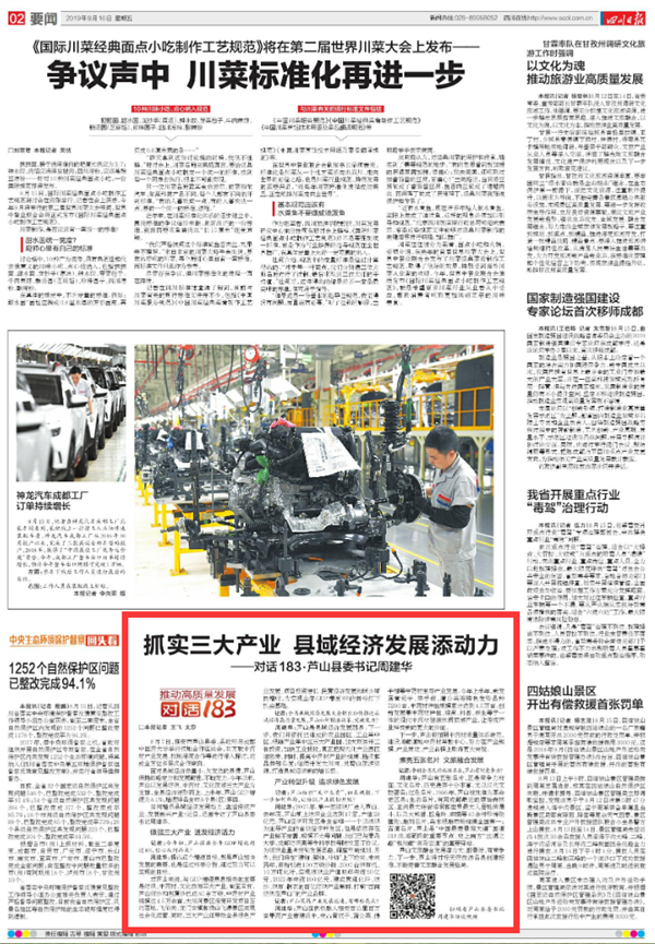 对于芦山来说,与GDP增速息息相关的主要是纺织、中药材、文化旅游三大产业发展支撑。截至目前,芦山纺纱和包覆纱已达80余万锭,中药材产业规模达4.5万余亩,大川河景区深度开发项目签约落地,飞仙关、龙门古镇和猴山飞瀑景区实现社会化运营。同时,三大产业还带动了全县绿色产业发展、项目投资增长、民营经济发展和城乡居民增收,为实现全年GDP增速8%的目标打下了扎实基础。
