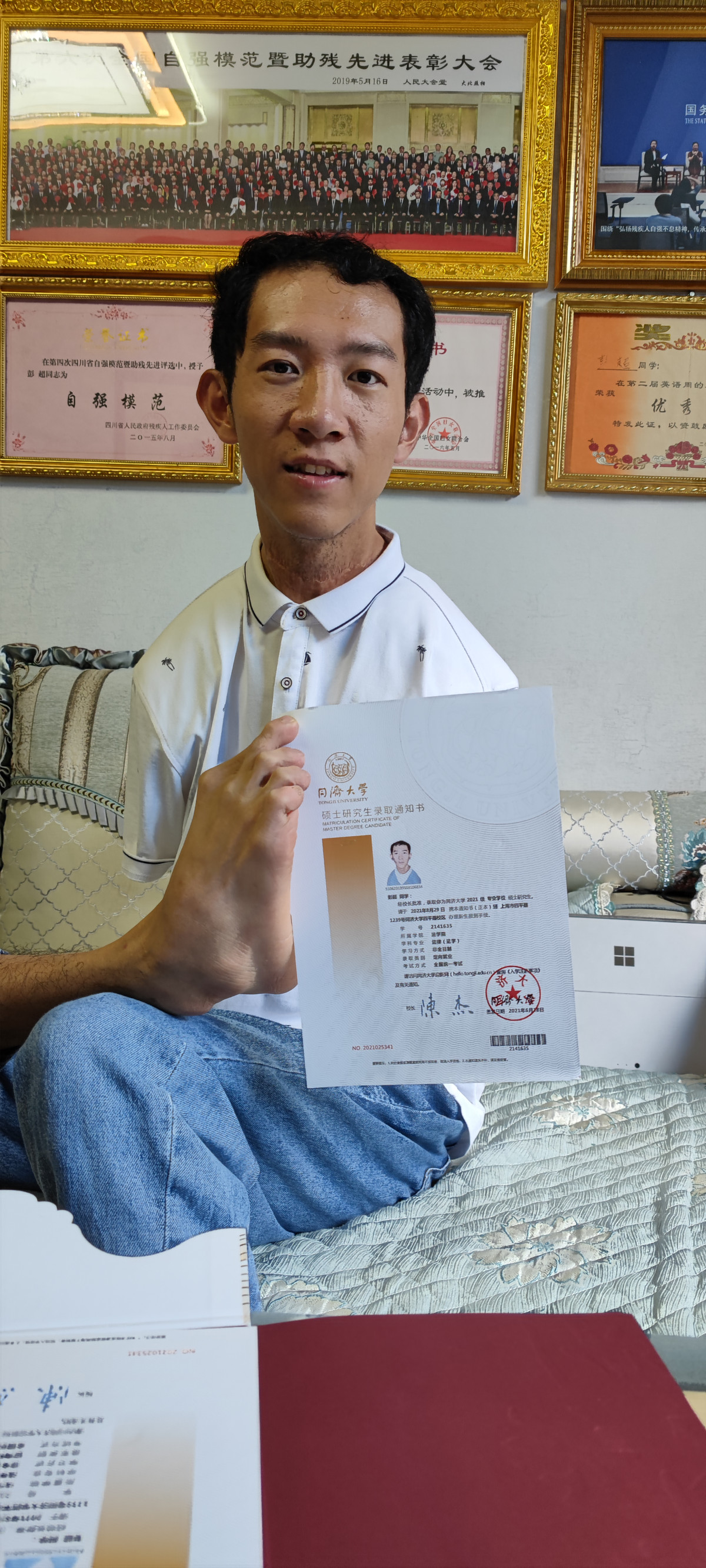 “太高兴了!去年一年的努力终于有回报了!”7月10日,收到了同济大学法学院研究生录取通知书的四川省攀枝花市无臂男生彭超告诉记者,拆开录取通知书的时候,他非常激动,让父亲用视频把这一刻记录了下来。