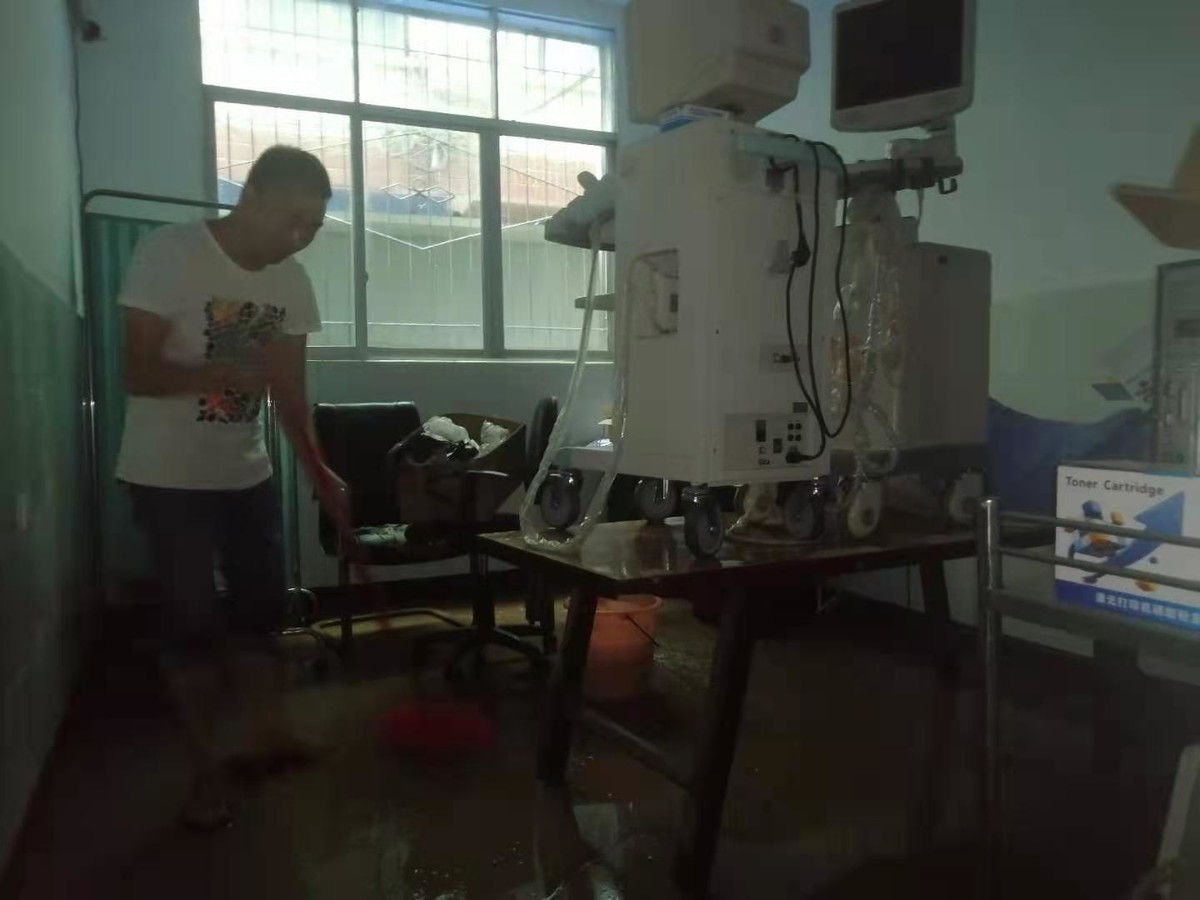 病人被安顿好后,安装在卫生院一楼的DR机、彩超、洗胃机、全自动生化仪等设备的检查室也已进水。无奈之下,抢险的医生只得拔掉设备的插头,将仪器放在桌子或床上。因DR机的检查室地势较低,洪水漫过水位达80公分,医护只能将复杂的仪器拆成多块,其中显示器、探头、电脑等设备拆完后送到3楼。