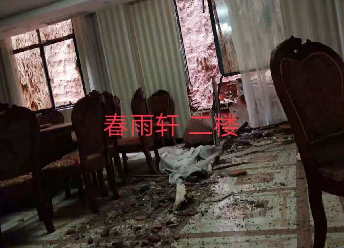 原来,在7月10日晚上8点多,周文华一行人巡查地灾滑坡点时发现,春雨轩酒店后山的滑坡体更加严重,并伴有落石声。经过劝说,12名客人及工作人员提前撤离。到了晚上11点多,险情发生,后山落石将酒店墙壁砸穿,营业场所砸烂。所幸,人员早已撤离。