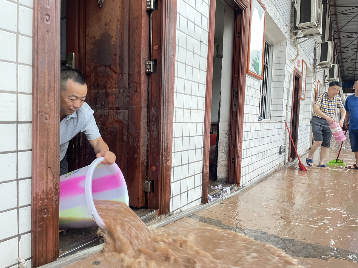 下午5点40分左右,36公里外的白衣镇上,水位也降至279米左右。在4台铲车和3台洒水车的帮衬下,凤凰街已经基本清理完毕,但由于淹没的街道、商铺较多,清淤排涝工作还需要再持续两天。