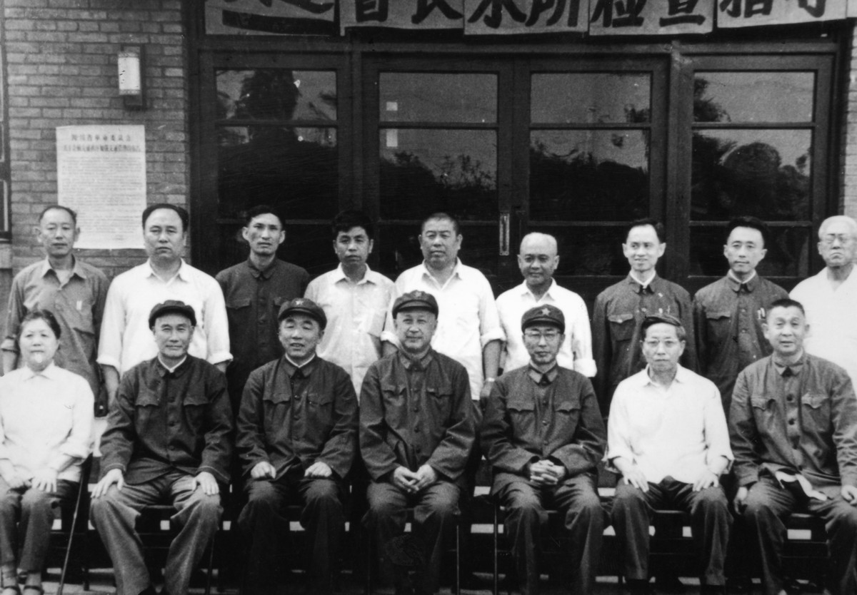 1978年,时任国防科委领导钱学森等视察五八五所时合影,前排左二为李正武、左三为钱学森、前排右一为孙湘(图片由省科协提供)