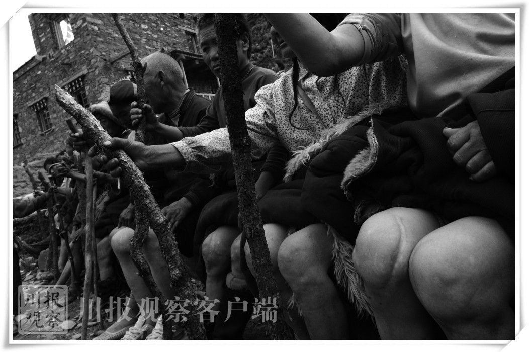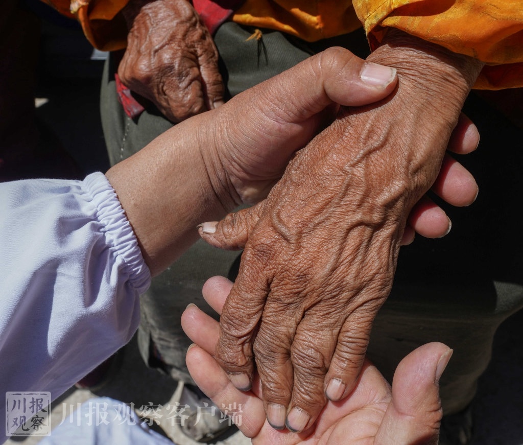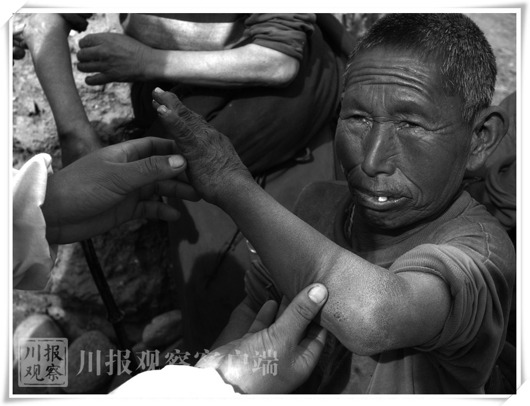 进入院子里,阳光下几位老人正在接受着卫生院医生的检查。眼前画面对于尹钢既熟悉又陌生。尹钢说,那年他来到这里时也看到不少老人正在坝子里坐着,他们全都亮着变形的关节,有的在变形关节上面敷着艾草。后来人们告诉他,那是为了减轻点痛苦的土办法。