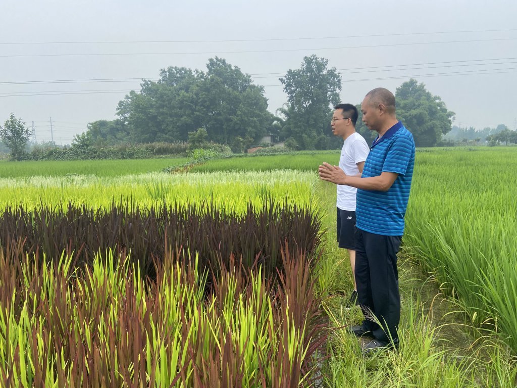 成都市农林科学院水稻专家在试验田边观察景观稻长势