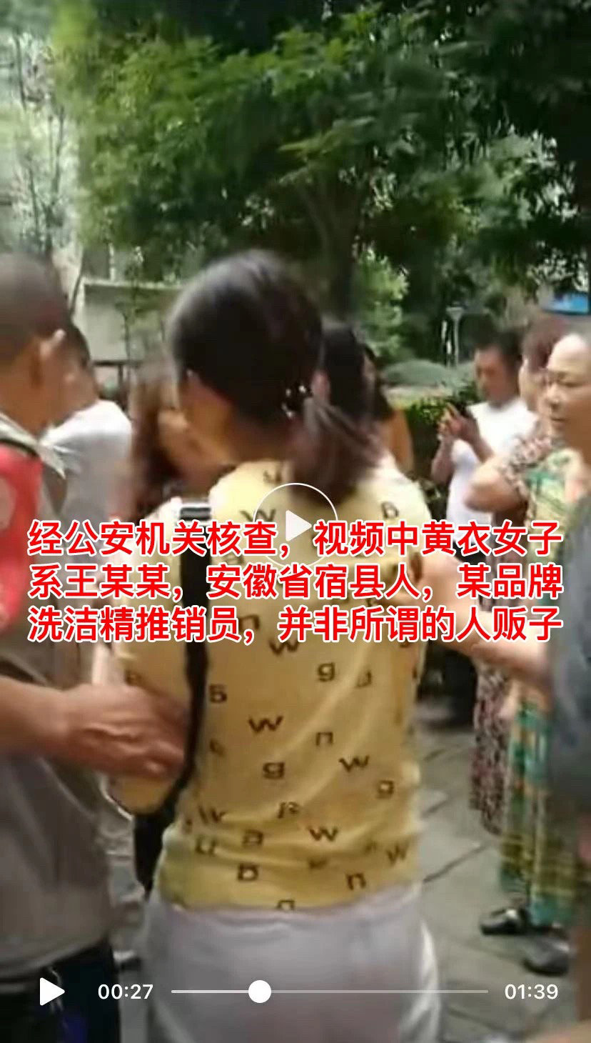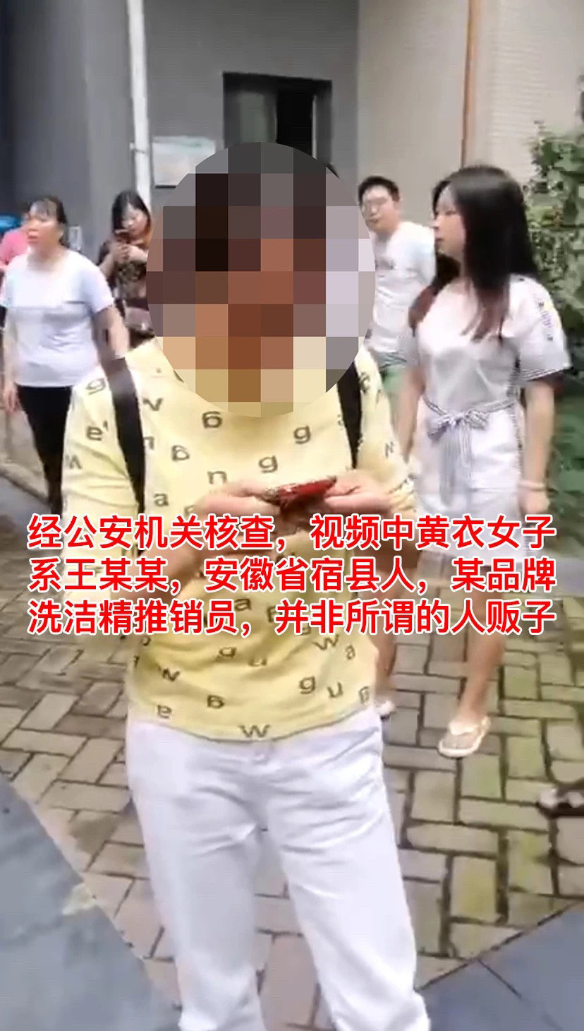 网传视频中的黄衣女子系王某某,安徽省宿县人,某品牌洗洁精推销员。2021年7月10日12时许,其在新怡花园A区挨家挨户敲门推销洗洁精时,被小区业主怀疑是“人贩子”,双方发生纠纷。上述情况被业主拍摄视频后上传网络。