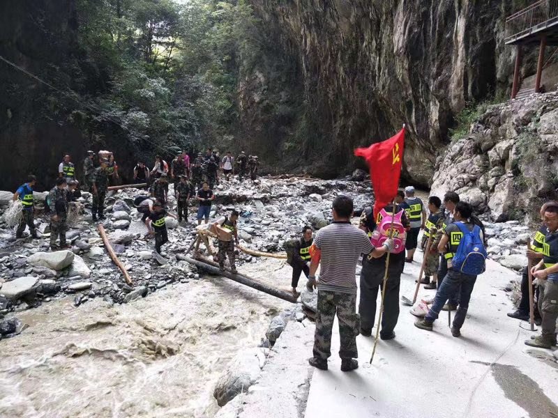 从新民村炳阳沟口到村活动室有3.47公里路程,一路地势险峻,一边是湍急的河流,一边是陡峭的山崖。每到公路断道处,武警官兵、当地民兵、党员突击队和当地村组干部都需要就地取材,寻找合适的木头搭建便桥,他们用铁丝和抓钉将几根木条捆绑,就形成了宽约三十公分的便桥,每座便桥的搭建都需要半个小时左右。