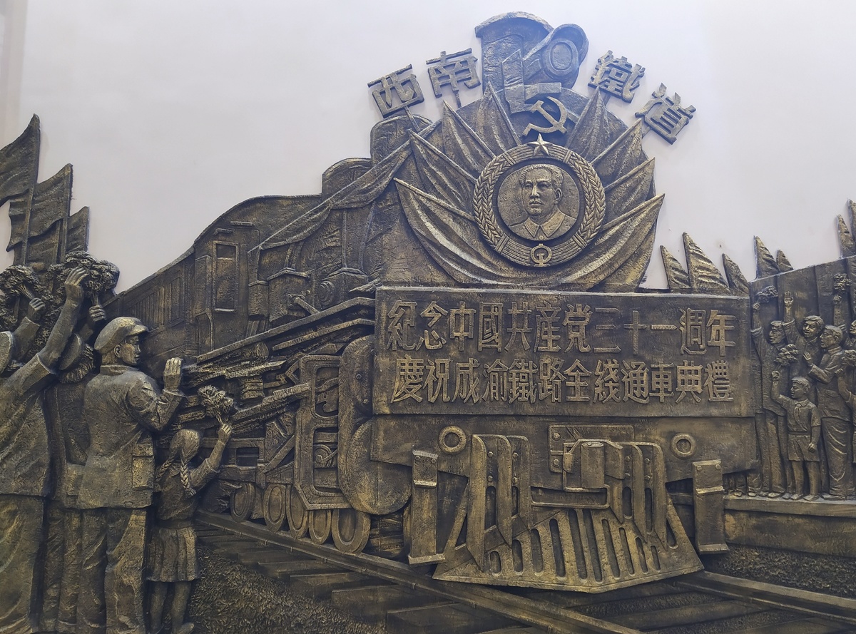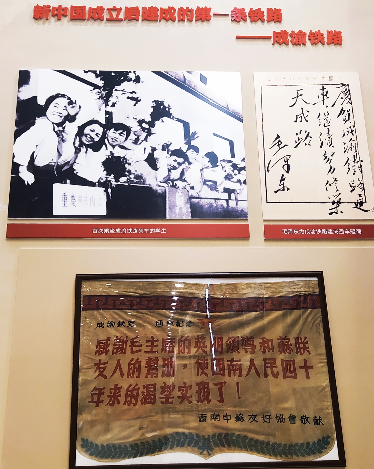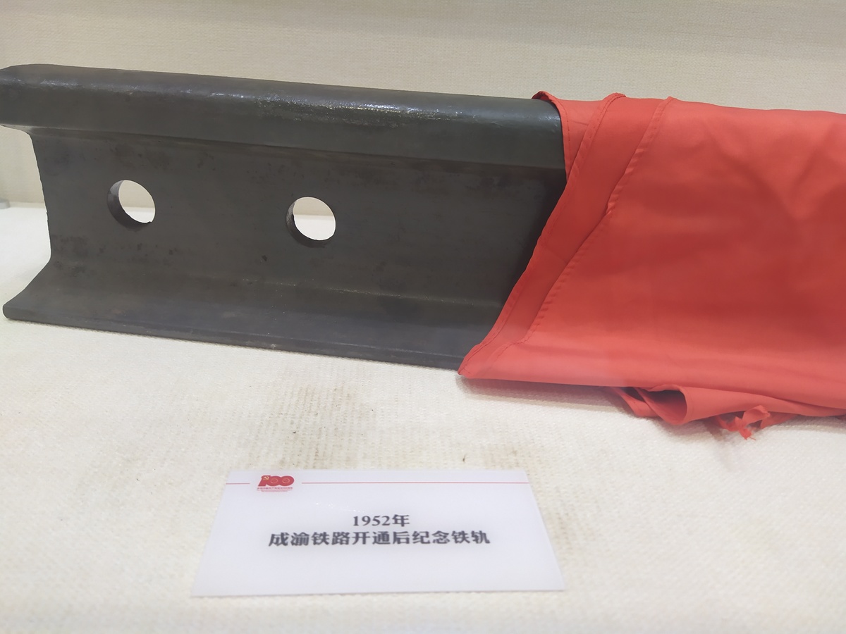 成渝铁路是新中国成立后修建的第一条铁路。“壮丽史诗伟大飞跃”——四川省庆祝中国共产党成立100周年主题展中,有一段铁轨用红绸盖住了后半截,这就是成渝铁路纪念铁轨。
