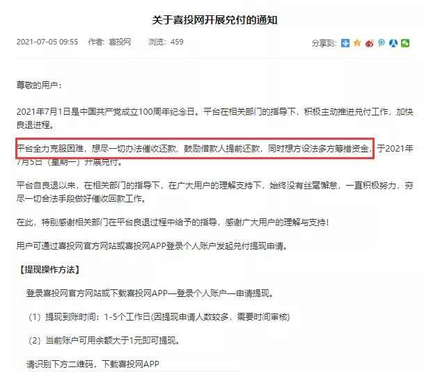 然而,2020年2月17日,喜投网突然通过发送用户账户系统消息的形式,宣布良性退出。有媒体报道,喜投网其实早已于2019年12月26日就收到了第三方支付公司“连连支付”终止服务的函件。而喜投网方面隐瞒不报,让所有出借人仍不断充值资金。据警方最新通报,宣布良性退出一年多后,喜投网当前待偿岀借人本金6.89亿,待偿岀借人充提差本金6.25亿,涉及出借人数5412人。历史交易总金额40.07亿,涉及出借人数17059人。金融投资报记者注意到,目前喜投网官网仍在运营当中,且还对外发布了招聘工程师的信息。7月5日,官网发布最新一期兑付通知,称用户可通过喜投网官方网站或喜投网APP登录个人账户发起兑付提现申请,预计1-5个工作日可到账。不过,通知里表示“平台全力克服困难,想尽一切办法催收还款、鼓励借款人提前还款,同时想方设法多方筹措资金”。
