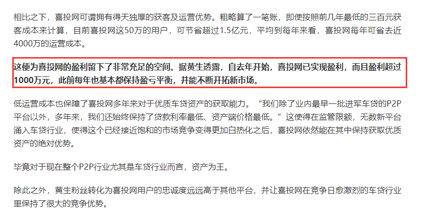 在业内看来,正是那一篇篇10万+的爆文,让黄生圈了一大批粉丝,足够的流量为他的P2P导流、变现。要知道,2014年P2P疯狂扩张时,各大平台为了争夺用户,不惜投入巨额资金打广告。而黄生,将其本身拥有的庞大粉丝群,妙地转化为喜投网的用户,省下了巨额获客成本。此前,黄生在采访中也表示:“喜投网是唯一没有营销投入的P2P平台。”当被问及原因时,他反问道:“我一篇微信几十万,甚至几百万阅读量,最少也是“10万+”,粉丝粘度和忠诚度非常高,在别的地方投广告会有这么好的效果吗?”2017年,一些P2P平台开始爆雷,行业遭遇危机之际,曾有报道称2017年喜投网已实现盈利,而且盈利超过1000万元,此前每年也基本都保持盈亏平衡,并能不断开拓新市场。然而,随着警方最新通报披露,曾号称逆势增长的喜投网爆雷已成事实。