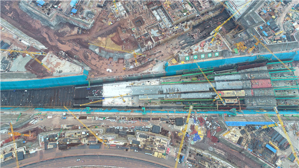 更具创新的是,施工过程中,464米长的大铁隧道顶部混凝土浇筑带被分成了12个段,每一段又划分为搭设支模架、绑扎底部钢筋、浇筑底部混凝土、绑扎中层钢筋等若干个工序,采用递推流水施工方式,在每一段的一个工序完成后,随即进入下一段的工序,如此循环往复,高效利用每一分钟时间。