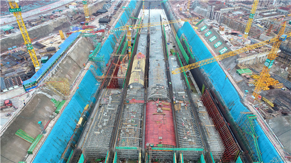 所谓现浇叠合施工,即将数米厚的弧形混凝土分层浇筑,先浇筑一层由弧形钢筋和混凝土组成的暗拱圈受力体系;再在上面分次浇筑只需平直钢筋的混凝土层,形成平板型顶板用以支撑航站楼,这样可以简化弧形拱板支持体系龙骨制作安装,优化比脚手架钢管还粗的弧形钢筋的制作工期和在混凝土内的分布,同时使上部航站楼的基础更加平整稳固。