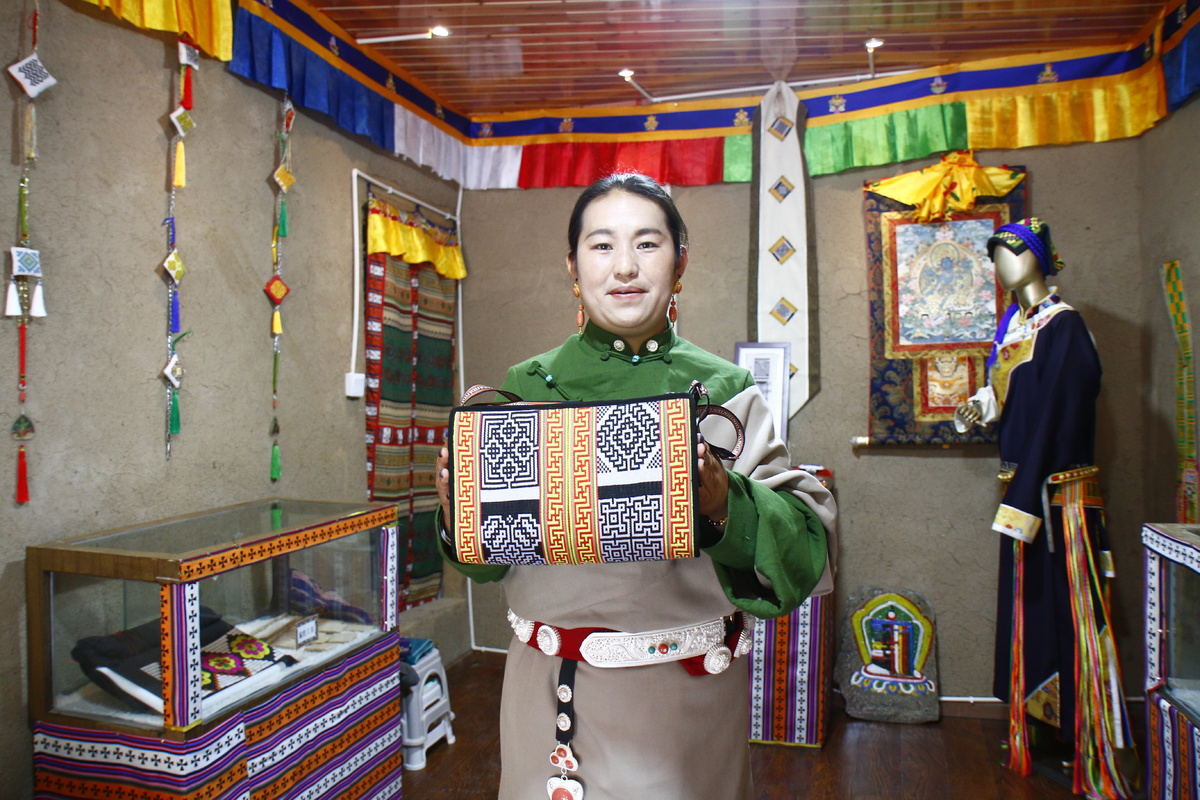 扎斯满是藏织非遗传承人,2018年在都江堰四川工商职业技术学院参加了民族刺绣工艺品制作扶贫培训班。后参加了阿坝州妇女居家灵活就业藏织藏绣技能培训班。2019年参加贵州盛华学院唐人坊非遗传承人培训。