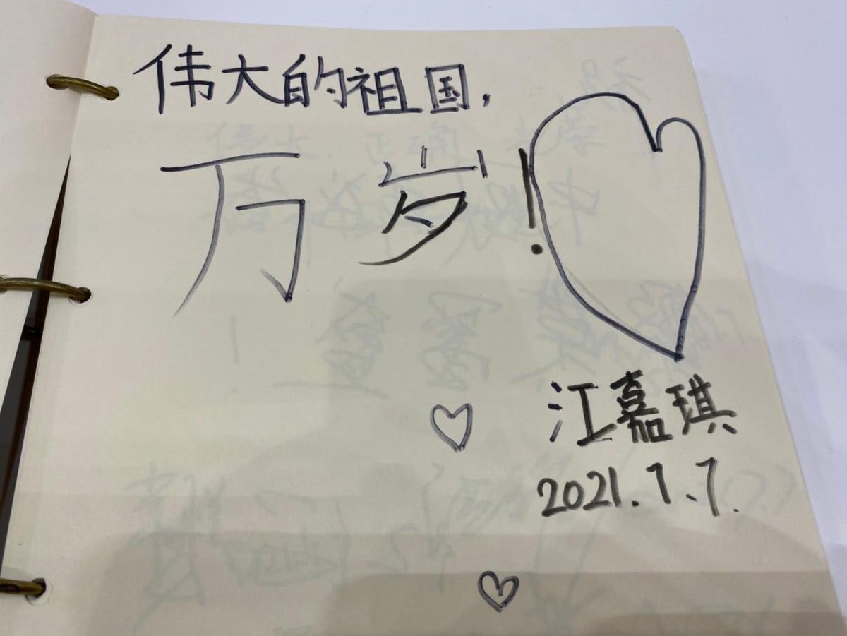 “我爱您中国!请您放心,吾辈当自强!我为自己是一名中国人而感到无比自豪!”此前一位观众在留言簿上这样写到。