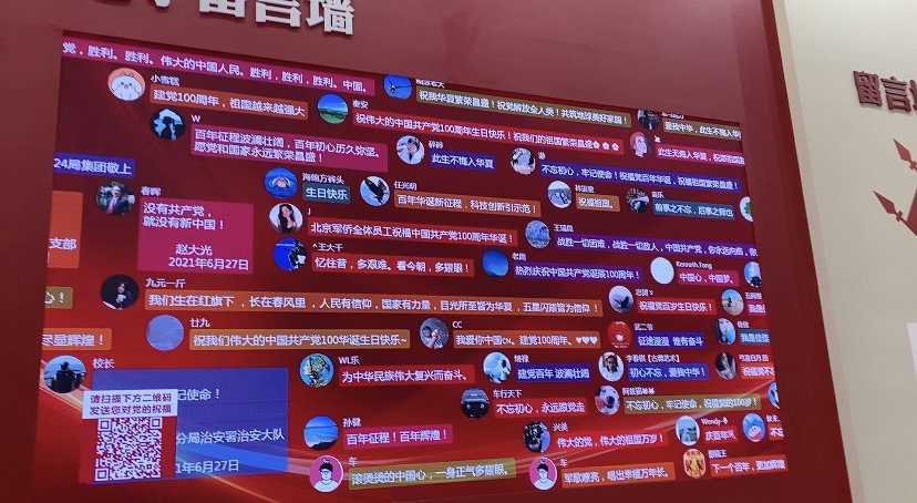 除了纸质留言簿,旁边的电子留言墙上,满屏的弹幕,也充分表达着看展观众的激动心声: