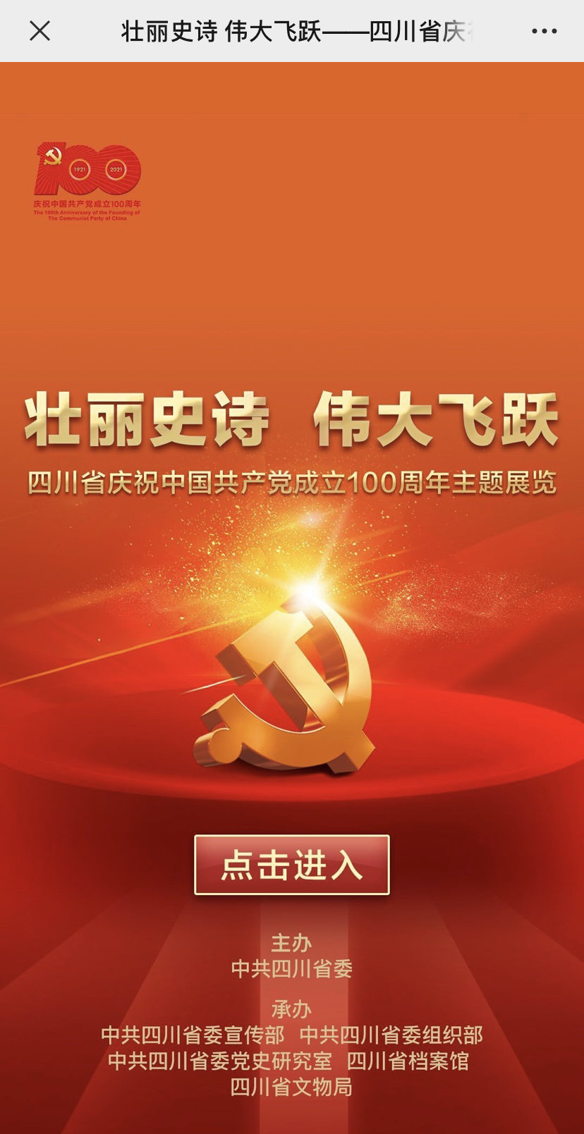 7月19日,“壮丽史诗 伟大飞跃”——四川省庆祝中国共产党成立100周年主题展览网上展馆上线,真实还原展览现场,并配有全程语音讲解,让更多观众随时随地沉浸式观展。