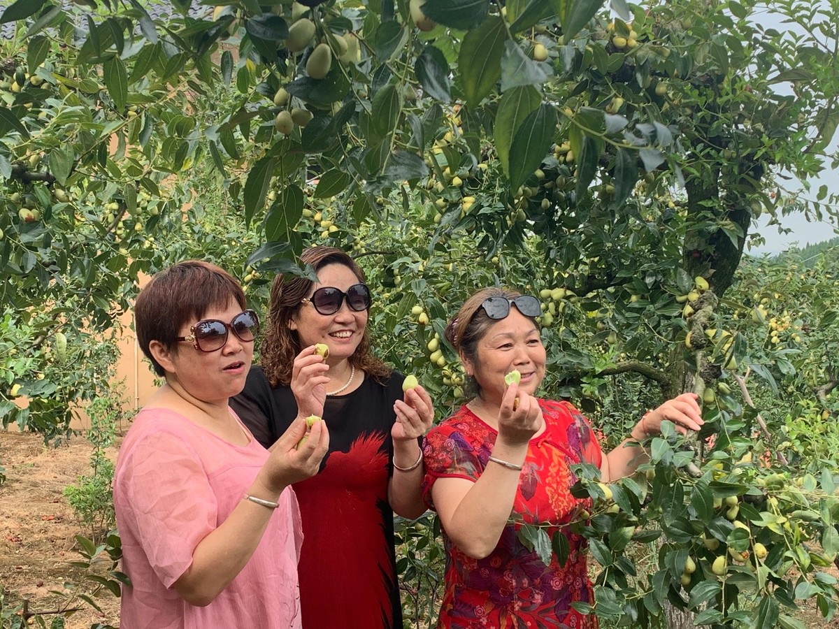 记者在现场看到,漫山遍野的枣树,一棵棵结满了青红相间的枣子,随手摘一颗放在嘴里,脆,甜,多汁。枣树丛中除了来自德阳各区县的游客,也有来自成都、绵阳、射洪等邻近市县的很多客人。