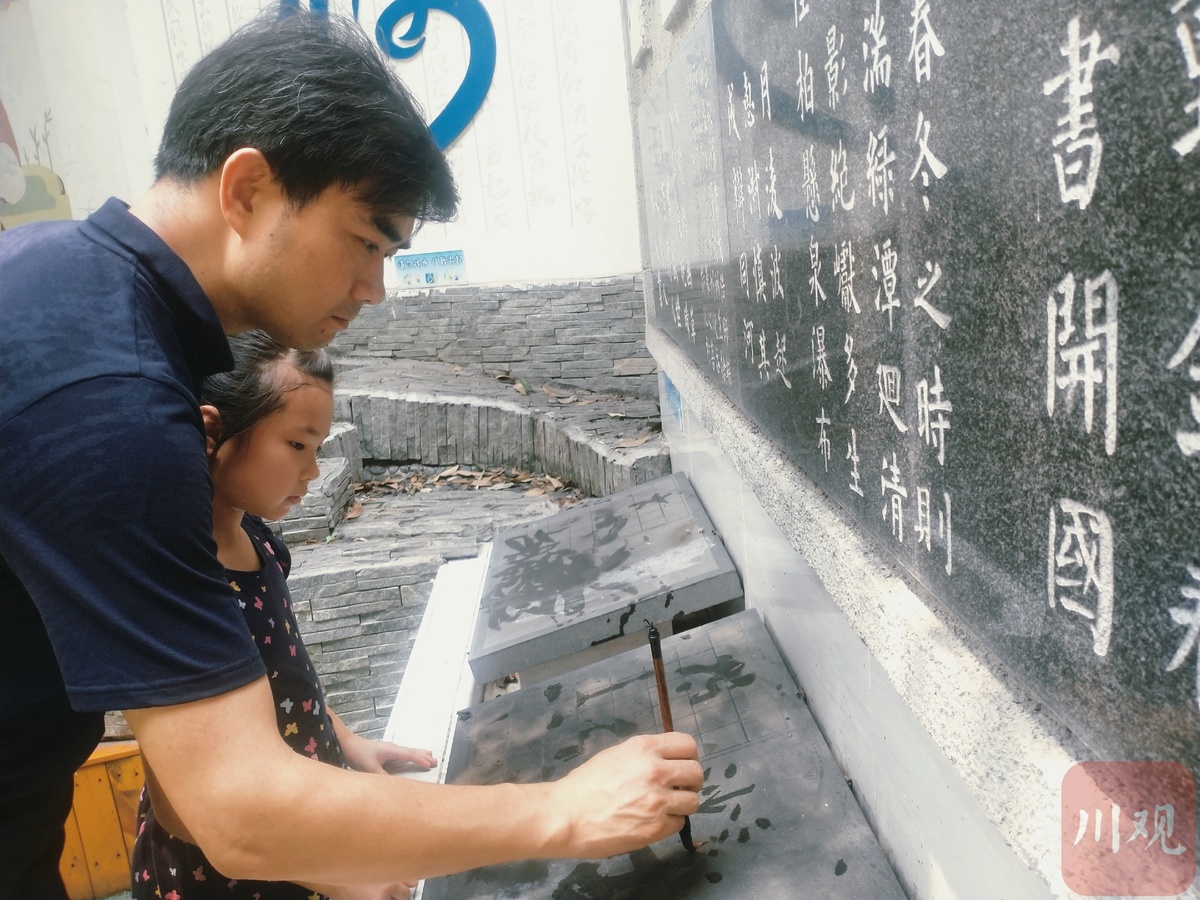 吃完午饭后,托管老师带着孩子们到学校“轮胎阵地”活动区做游戏,还有文静的小朋友在一旁用自来水毛笔写书法。“我们每天上午是作业辅导和体育锻炼的时间,学生们会去打乒乓球、攀岩、下午天气炎热,午休后,我们就到有空调的活动室观看红色电影,学习非遗竹编这样的特色课程。”校长季志彬介绍说,“下周我们还会开展全员运动会,让两个班60多个小朋友全部参与到体育活动中。”