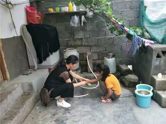 看见学生的手脏了,张小芳一边帮孩子洗手一边叮嘱她要爱清洁讲卫生。