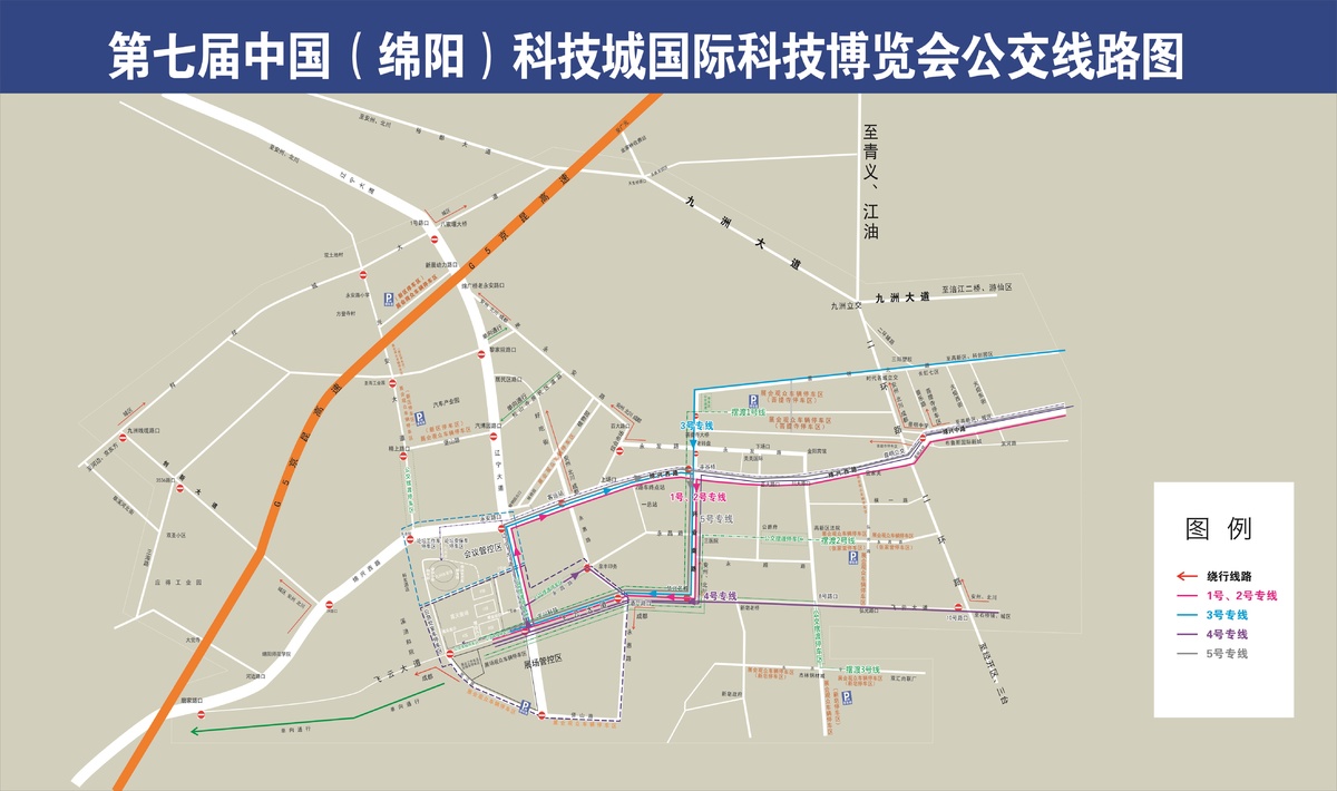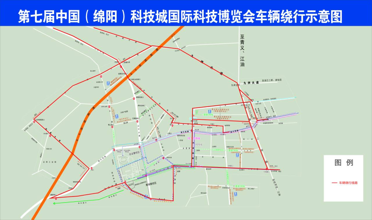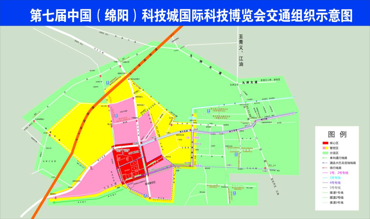同往年一样,第七届科博会的交通管控时间从9月5日上午7:00起至9月8日下午19:00,以九州体育馆为中心,采取“一核二路三圈”和“绿波调控”的方式进行分层交通管控和交通保障模式。核心区域(会展中心)实施严格的交通管制,与会展无关的社会车辆禁止驶入。