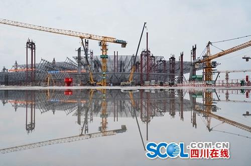 31日下午,雨过天晴。成都天府国际机场建设现场,刚刚焊接完成的钢结构表面被雨水冲刷得锃亮。