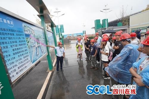 在成都天府国际机场建设指挥部旁的展板前,工作人员对新机场航站楼设计、功能区域划分、综合交通规划及配套设施建设等信息,进行了系统讲解。