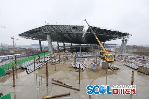 走出刚完成主体封顶的T2航站楼施工现场,承建方的工作人员提到,根据前期设计,未来时速达350公里的成自高铁将从该机场地下斜穿而过,其施工难度系数可谓史无前例。
