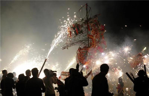 刘世全记得有一回,舞龙的时候围观的群众会向“龙”浇铁水,直到“龙”被烧来只剩“龙骨”,才会结束,现在为了安全起见,将铁水换成了礼花。虽说在舞龙时会全副武装,避免被烫伤,可是这也是不可避免的。
