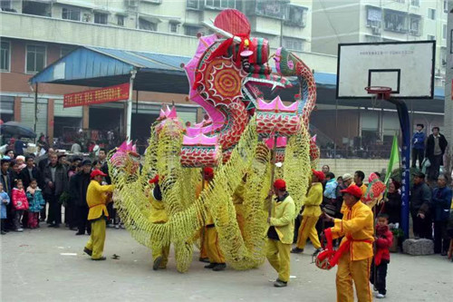 如今,偶尔能在小学里看到刘世全的舞龙影子——他将“火龙”带进了学校,每周三都会去一次胡市镇中心小学教课。“自己出钱扎了条小的龙,教他们咋挽、咋舞龙。”