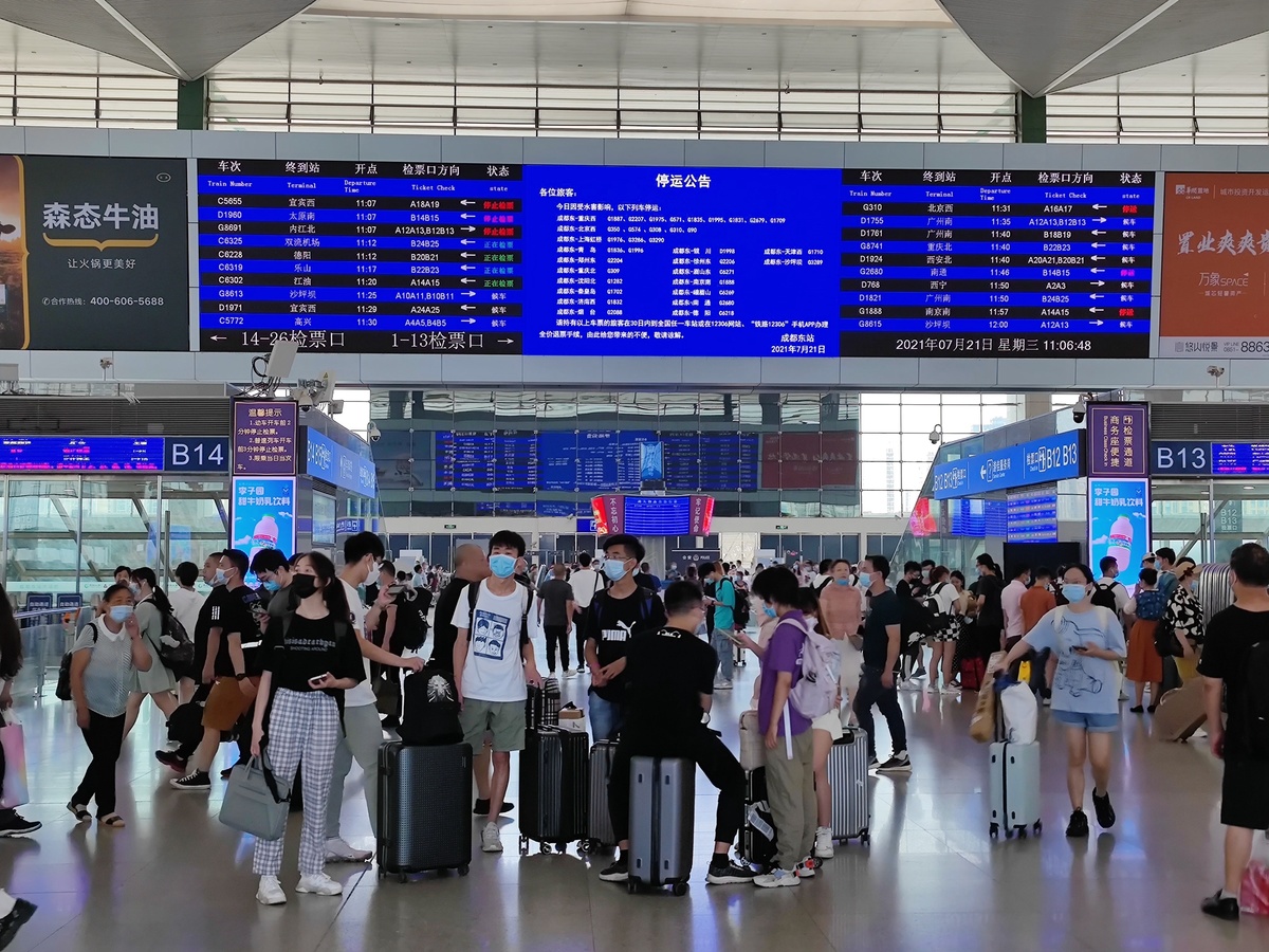 7月21日11时,中国铁路成都局集团有限公司发布消息,受河南省特大暴雨影响,当天成都局管内前往郑州方向的高铁、普速旅客列车全部停运。