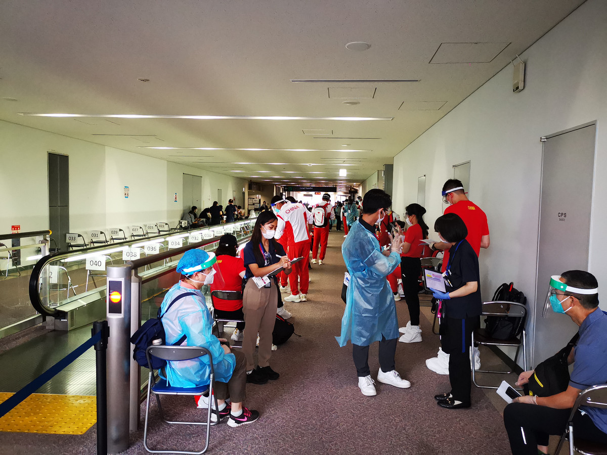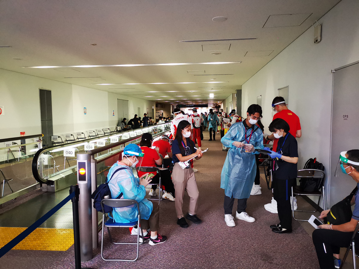 在抵达东京成田机场后,依次审核完护照、注册卡、健康卡、OCHA绿码、96小时、72小时内核酸检测报告等信息后,便是又一次的核酸检测,所有人自助采集唾液,并提交样本,经过2小时20分钟的等待,成都大运会观摩团拿到阴性证明,领取奥运证件。晚上19时20分,观摩团一行人正式进入东京境内。