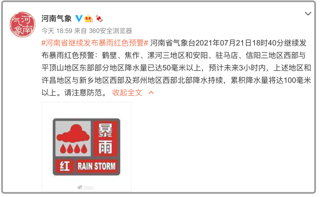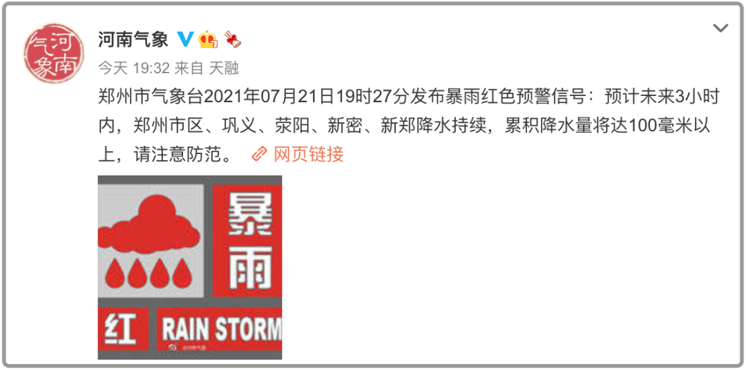 19时27分,郑州市气象台发布暴雨红色预警信号:预计未来3小时内,郑州市区、巩义、荥阳、新密、新郑降水持续,累积降水量将达100毫米以上,请注意防范。