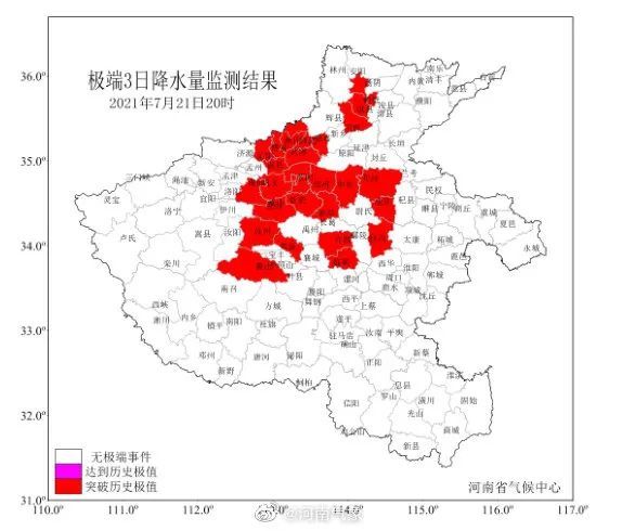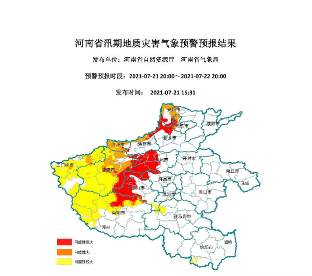 16时许,河南省更新汛期地质灾害气象预警预报:7月21日20时至22日20时, 河南省地质灾害预警预报达到红色预警的地区为:郑州中西部,平顶山西部及北部,南阳、新乡北部,洛阳中东部,许昌西北部,安阳、鹤壁西部,焦作北部及南部局部、济源东南部,巩义、汝州大部,发生地质灾害的可能性很大。