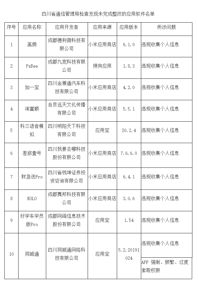 截至目前,尚有10款APP未完成整改,上述APP应在7月26日前完成整改落实工作。逾期不整改的,四川省通信管理局将依法依规组织开展相关处置工作。