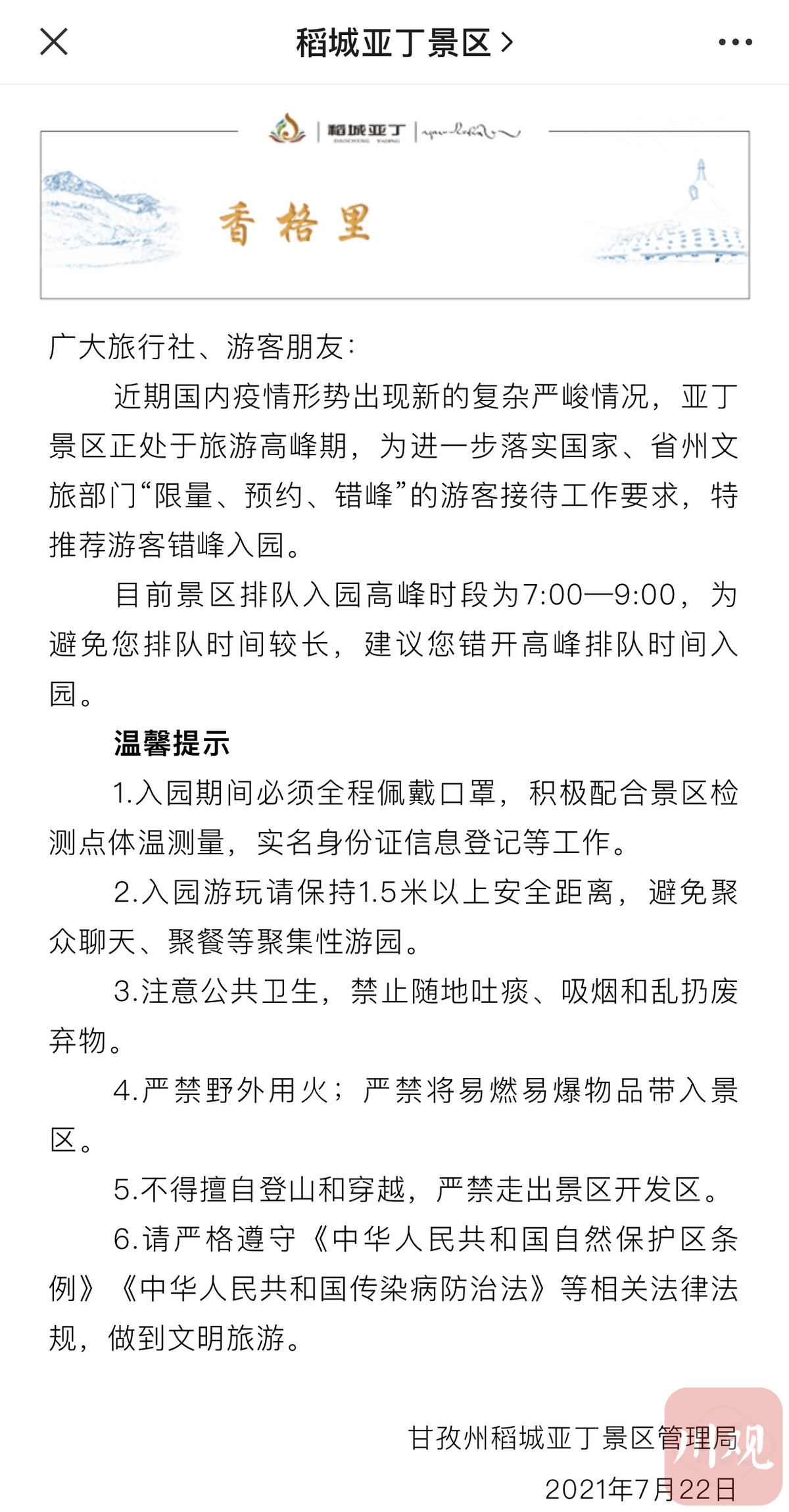7月22日,当前正处于旅游高峰期的稻城亚丁景区管理局发布分时错峰入园公告,称近期国内疫情形势出现新的复杂严峻情况,为进一步落实国家、省州文旅部门“限量、预约、错峰”的游客接待工作要求,特推荐游客错峰入园。