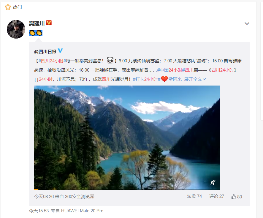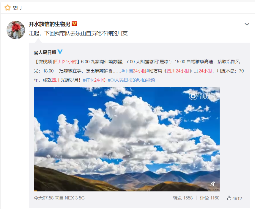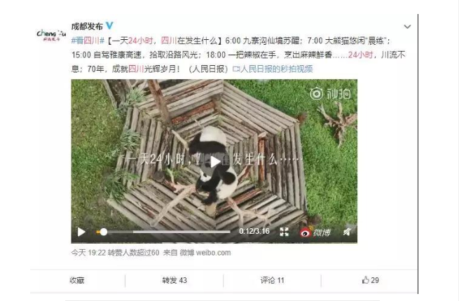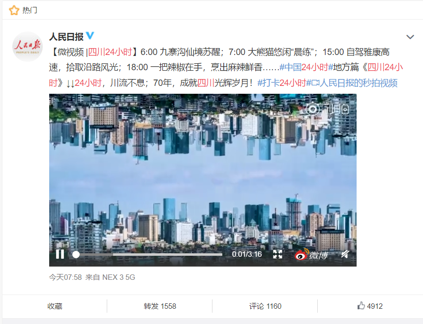 四川省各个政务新媒体也纷纷转载和发布《四川24小时》微视频,在网络上形成了刷屏的效果。