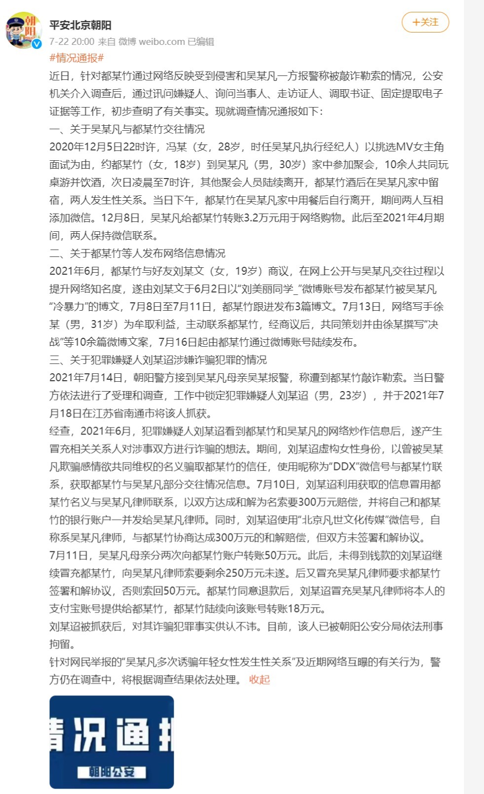 7月22日晚,北京市公安局朝阳分局官方微博发布通报称,2021年6月,都某竹与好友刘某文(女,19岁)商议,在网上公开与吴某凡交往过程以提升网络知名度,遂由刘某文于6月2日以“刘美丽同学_”微博账号发布都某竹被吴某凡“冷暴力”的博文。7月13日,网络写手徐某(男,31岁)为牟取利益,主动联系都某竹,经商议后,共同策划并由徐某撰写“决战”等10余篇微博文案,7月16日起由都某竹通过微博账号陆续发布。
