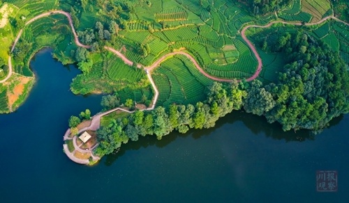 9月9日下午,在名山区解放乡银木村,蜿蜒起伏的茶园绿意盎然,水平如镜的月亮湖犹如一弯碧玉,镶嵌于茶园之间,形成“湖光茶色”的美丽景观。