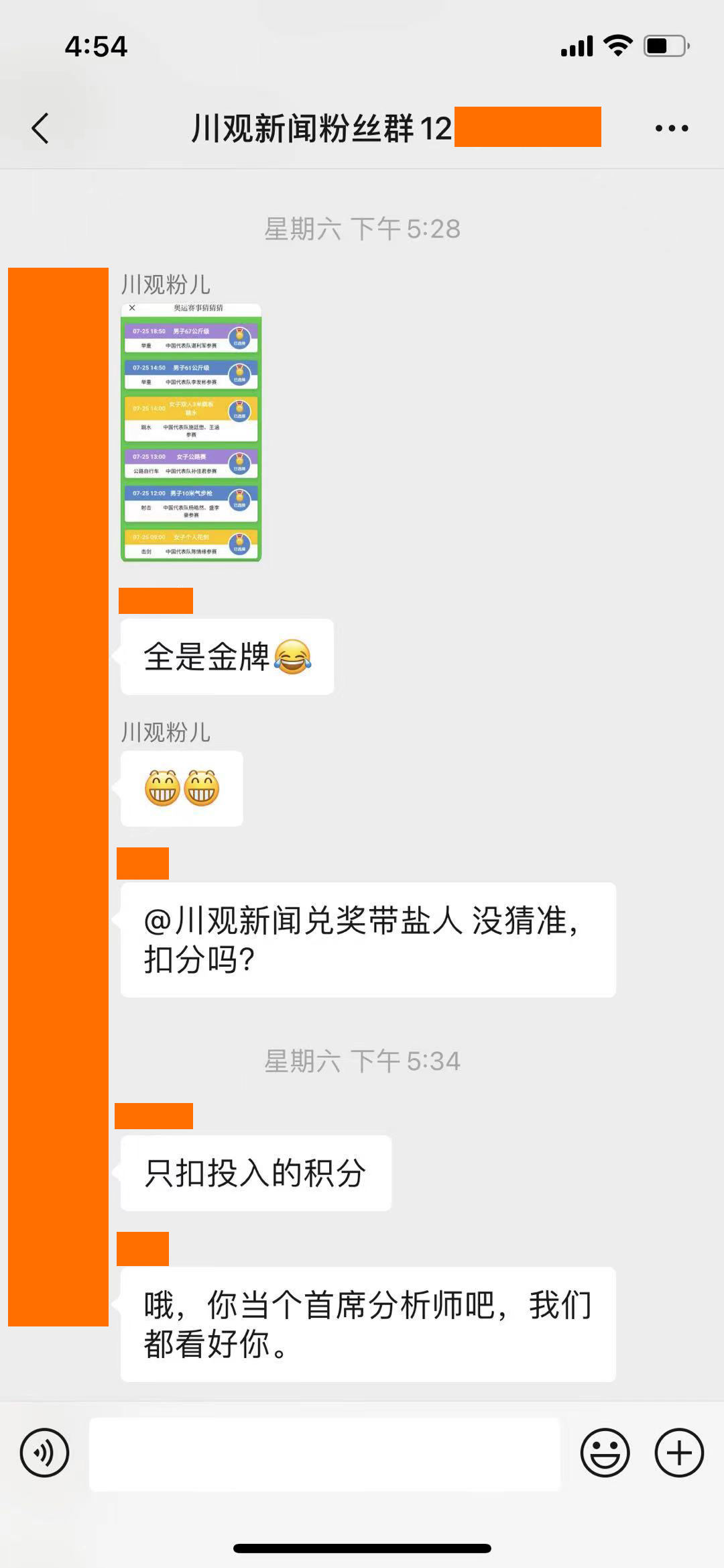 “你来当个首席分析师吧,我们看好你!”“奥运赛事猜猜猜 中国健儿冲冲冲”活动上线后,川观新闻粉丝群变身了奖牌猜猜群,伴随喜讯出现,寻求赛事分析师的呼声就出现了。