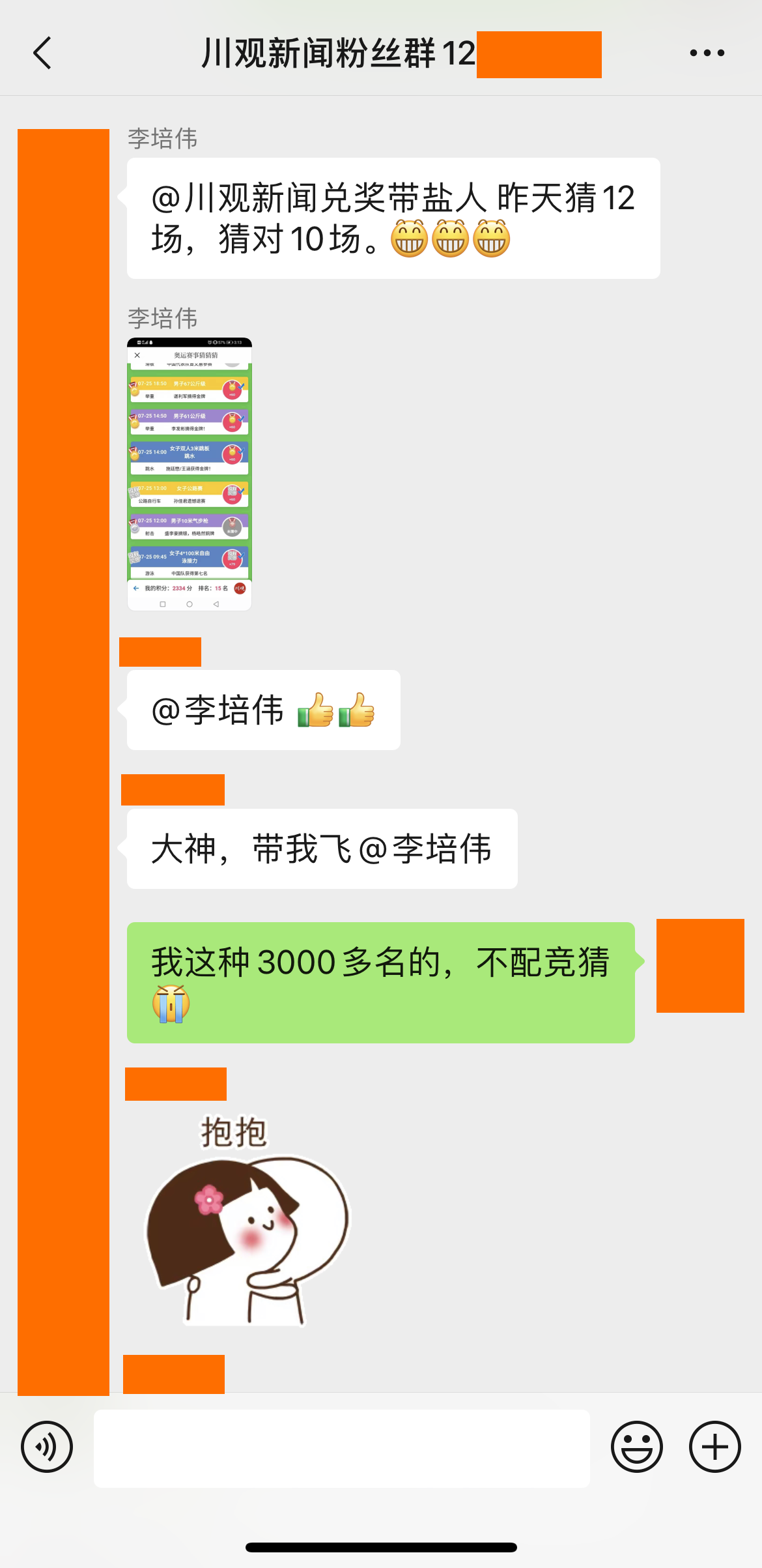 每一次奖牌的诞生,都伴随着一次群里的讨论高峰,“又猜中啦!”“一次都没有猜中!”有的用户沾沾自喜,有的用户唉声叹气。川观新闻用户“Vincent”一语中的,“奥运频道随便刷一下也要中两个嘛!”7月26日下午,粉丝群里开始呼唤排名第15位的@李培伟,请求“大神,带我飞”。在第二个比赛日的竞猜中,@李培伟 参与了12场竞猜,猜中10场。
