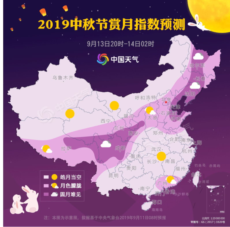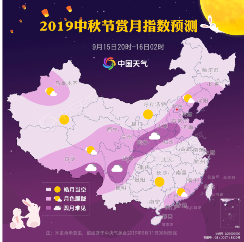 根据中央气象台发布的全国赏月预报地图显示,中秋节当天,我国新疆、内蒙古、河南等地大部天空晴朗,抬头即可见皓月当空的美景;黑龙江、吉林、辽宁、四川、陕西、西藏等地则天公不作美,阴雨绵绵,无缘观赏中秋明月。