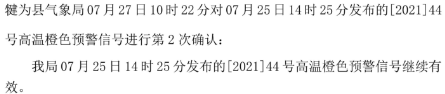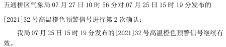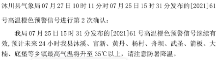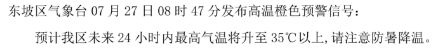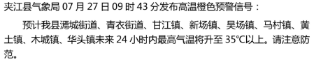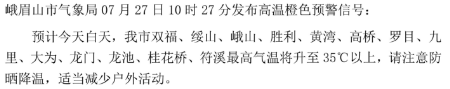7月27日上午,乐山市气象台继续发布高温橙色预警信号:市中区、沙湾区未来24小时内最高气温将升至35℃以上。