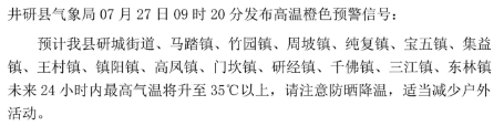 截至记者发稿,乐山市井研县、夹江县、沐川县、犍为县、峨眉山市、五通桥区都发布了高温橙色预警信号。
